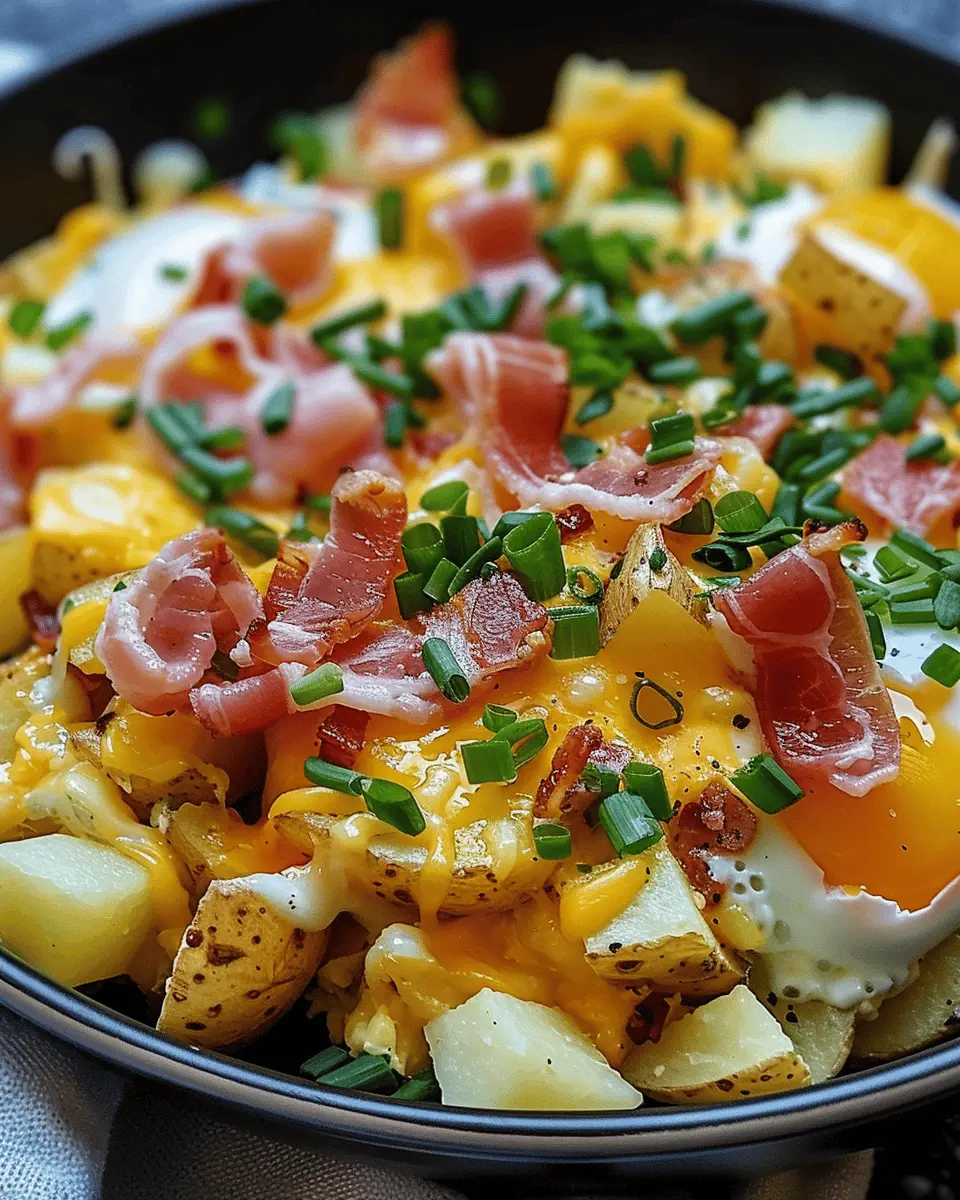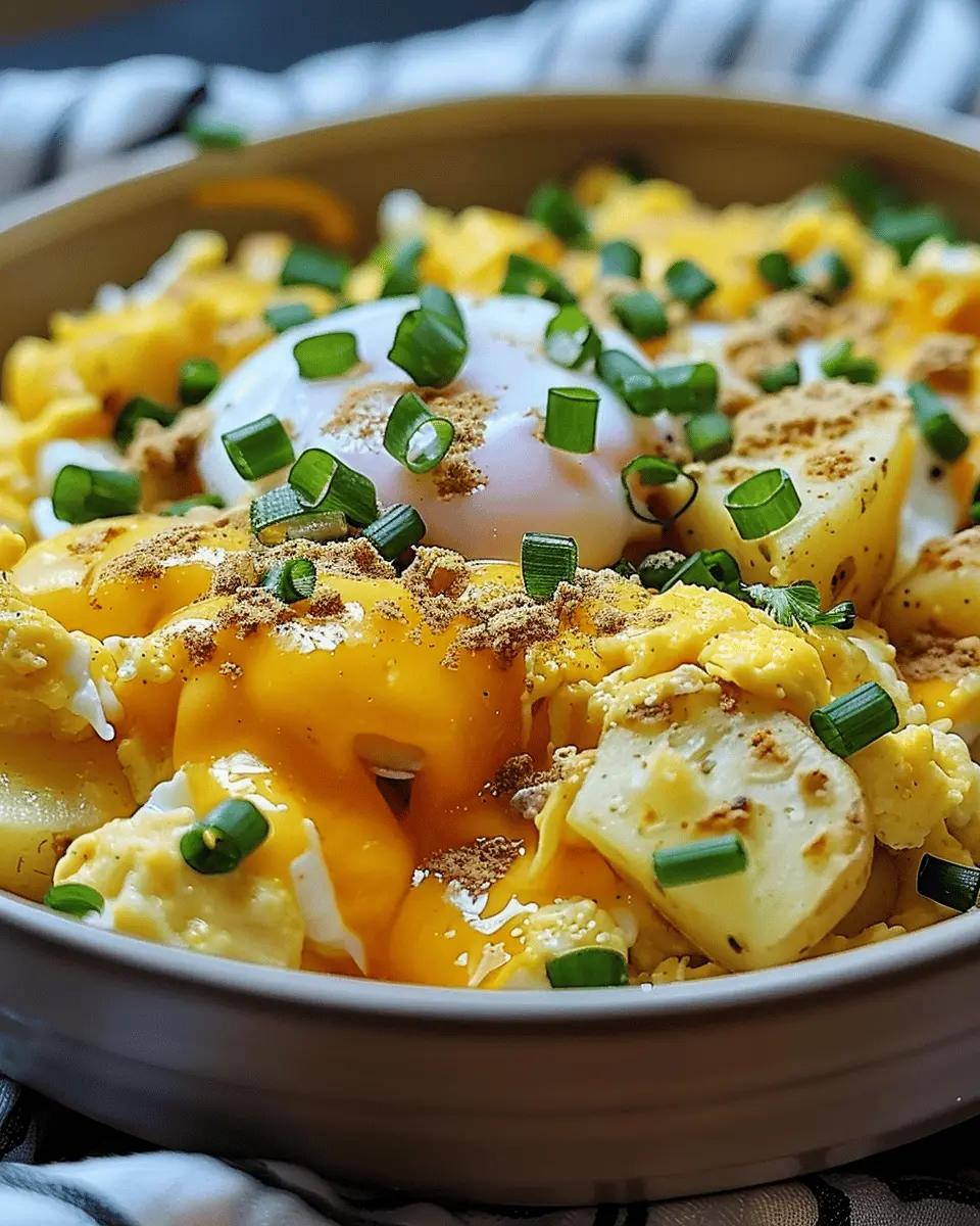 PrintCheesy Potato Egg Scramble with Turkey Bacon: A Comforting Twist