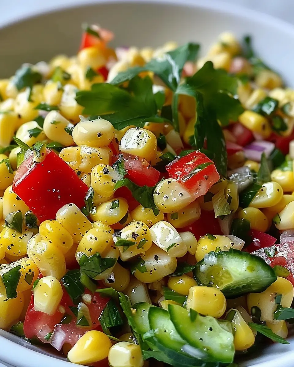 Nutritious Ingredients: Packed with fresh veggies, including tomatoes, cucumbers, and, of course, corn, this salad is a powerhouse of vitamins and minerals. According to the Harvard T.H. Chan School of Public Health, incorporating more vegetables into your diet is essential for maintaining your health, and corn salad helps you do just that with delicious ease.