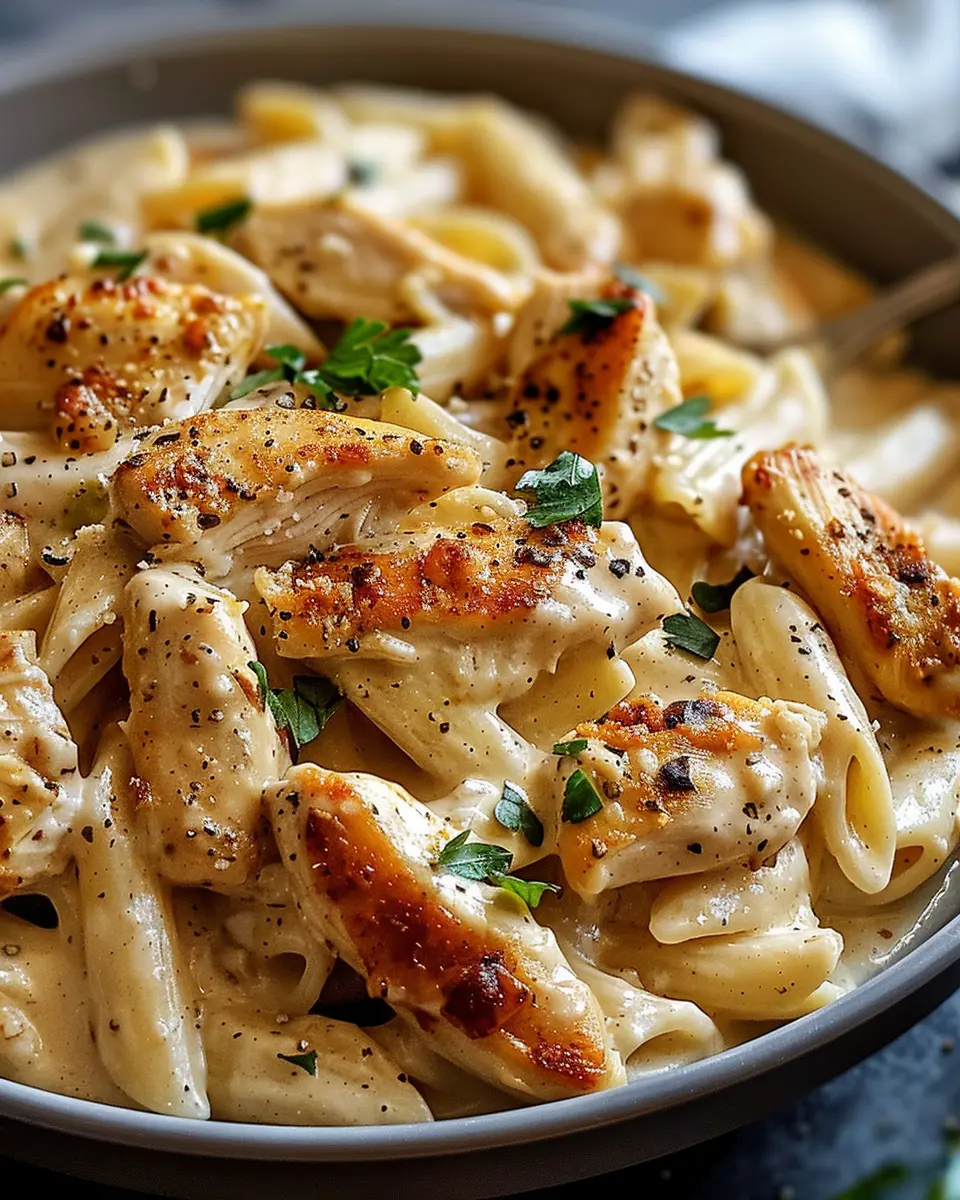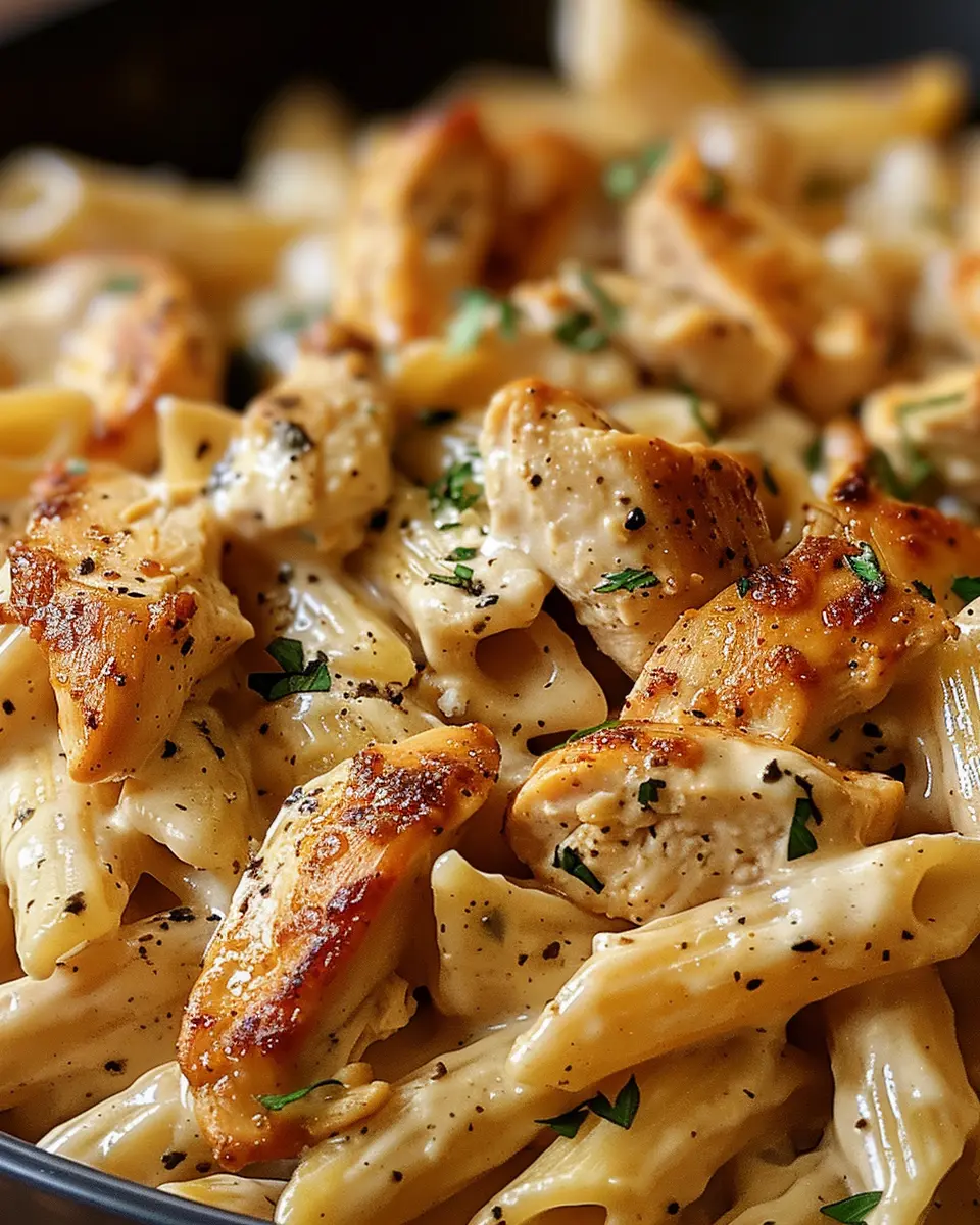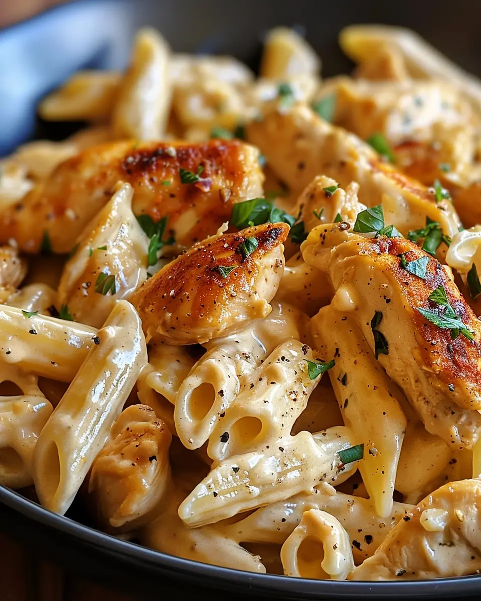 It’s time for the magical moment when everything comes together! Add your cooked pasta to the skillet along with the sliced chicken. Pour the creamy sauce over and toss everything together until the pasta is well-coated.