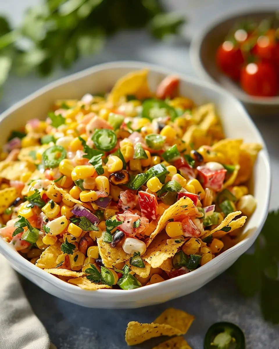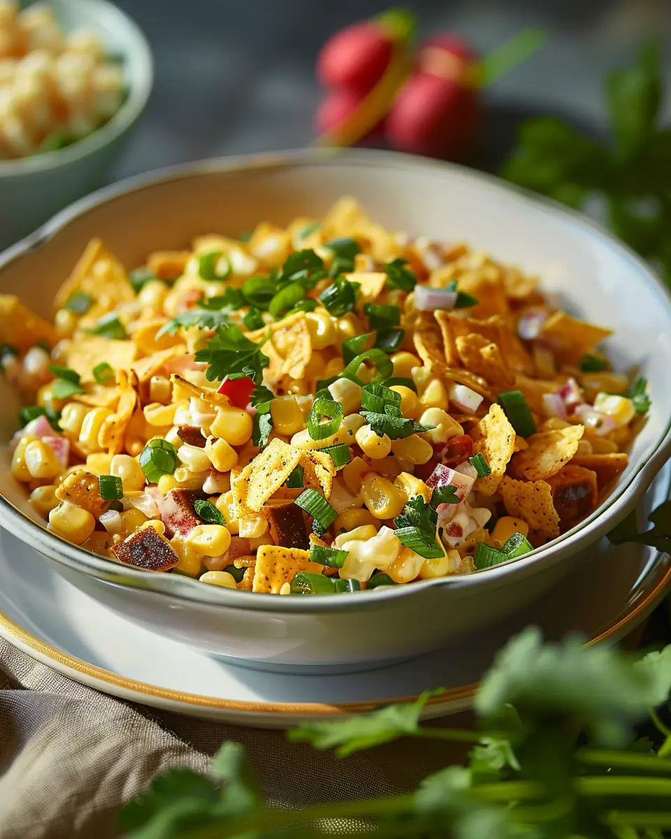 A delicious and creamy corn salad featuring crunchy Fritos and savory turkey bacon, perfect for summer picnics and potlucks.