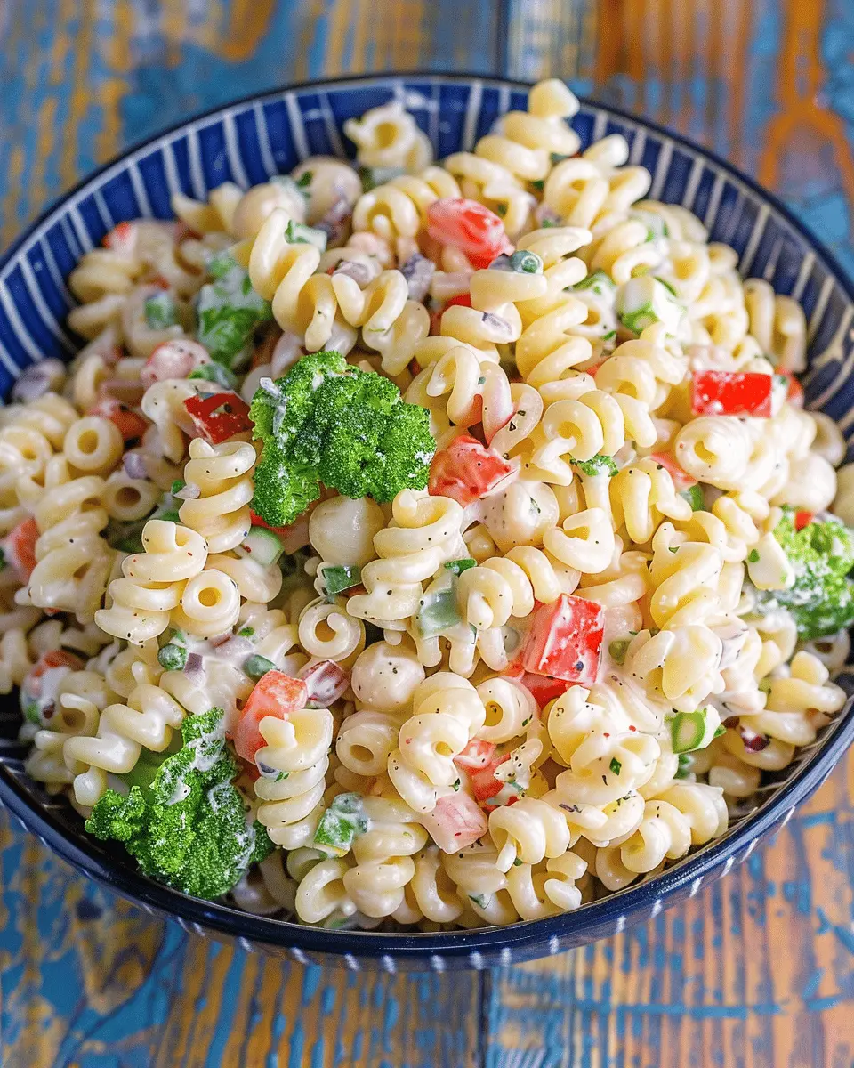 When you’re ready to serve, give it a good stir and fine-tune the seasoning again if necessary. There you have it—a beautifully vibrant, creamy pasta salad that’s sure to impress your friends and family. Enjoy!