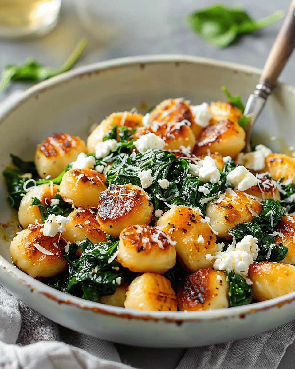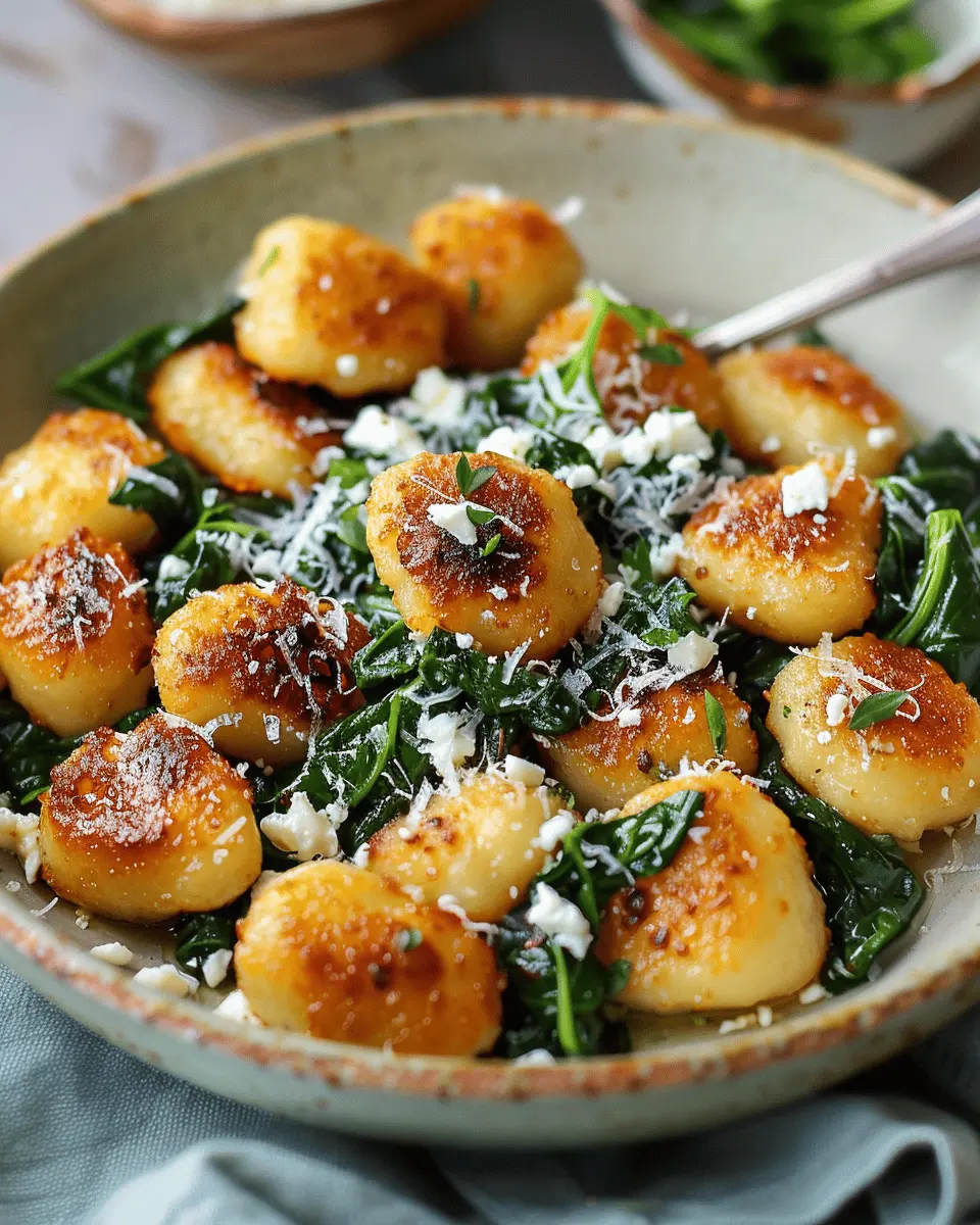 One of the perks of crispy gnocchi with spinach is its versatility. Whether served as a light lunch, a hearty dinner, or a side dish, it pairs wonderfully with a variety of flavors, from savory to tangy, thanks to the addition of feta cheese and fresh herbs.