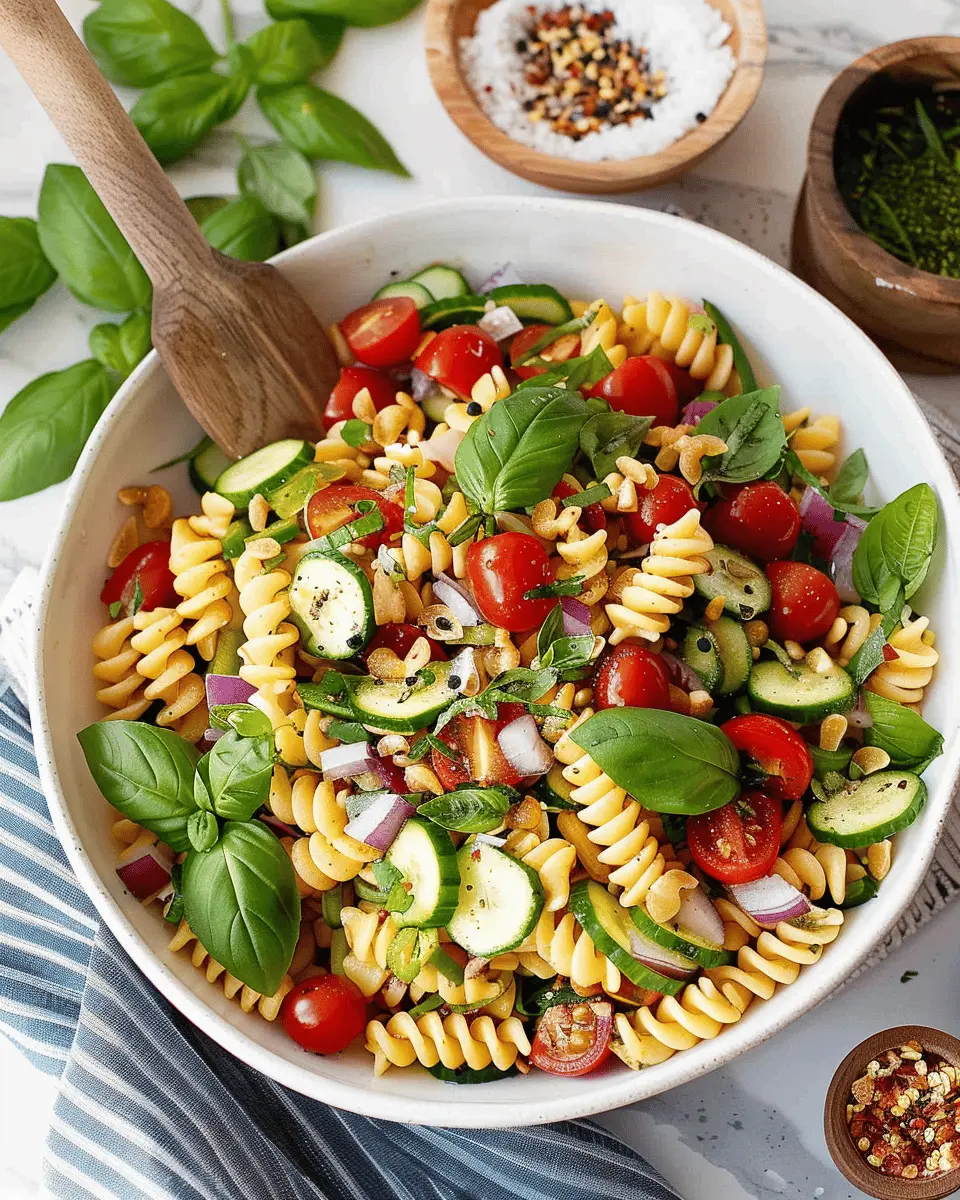 Presentation can take your easy pasta salad to the next level. Serve it in a large glass bowl to highlight the vibrant colors, or for individual servings, use mason jars. Layering the ingredients in jars not only looks appealing but also makes for easy transport if you’re taking it to a picnic or potluck. If you want to impress, try garnishing with fresh herbs like basil or parsley for a pop of color and flavor.