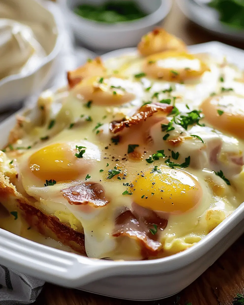 A rich and indulgent casserole combining the classic flavors of Eggs Benedict with turkey bacon and chicken ham, perfect for breakfast or brunch.