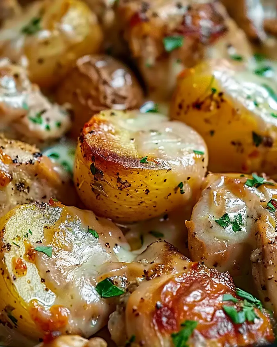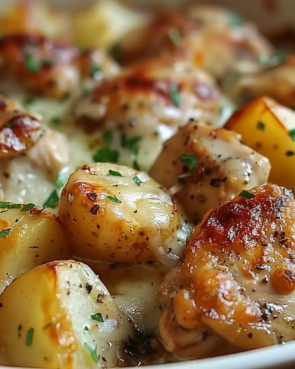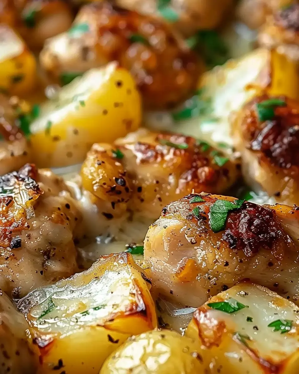 - Pour the mixture over the chicken and potatoes, then sprinkle with Parmesan cheese.