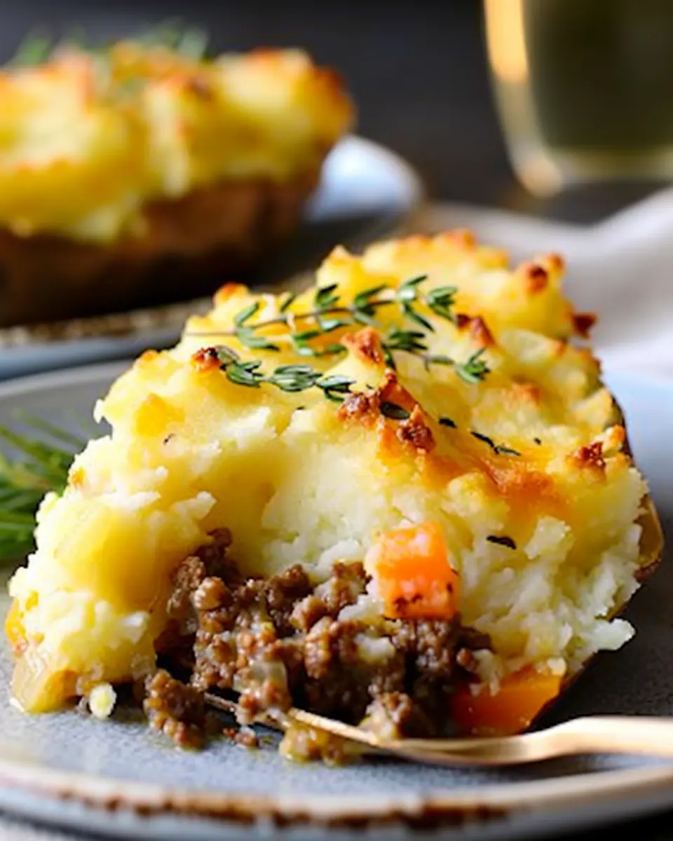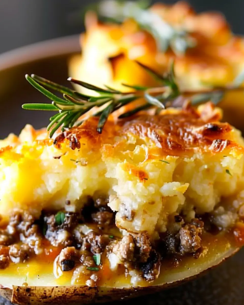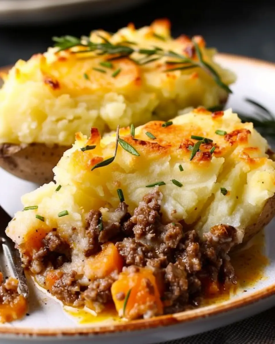 Enjoy the delightful fusion of shepherd’s pie and baked potatoes in this hearty dish!