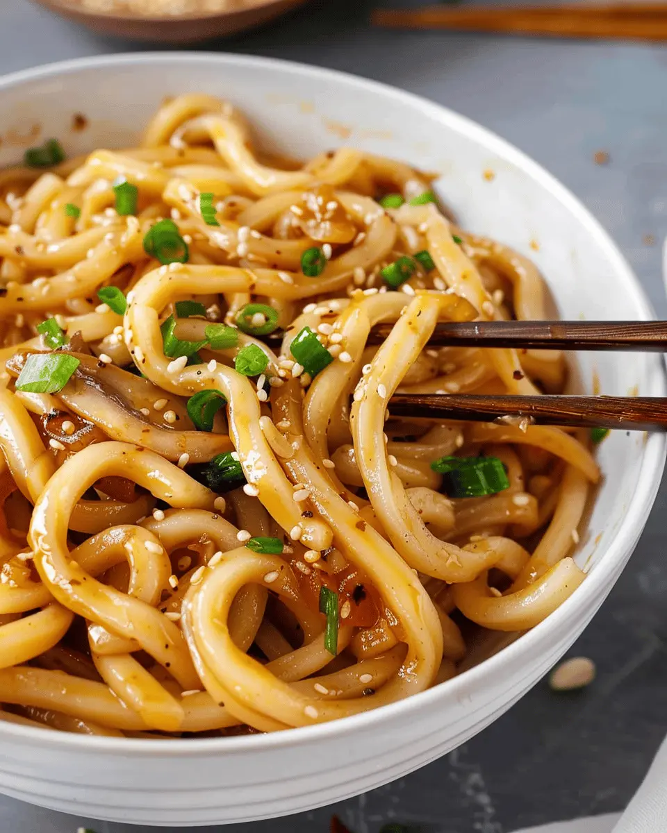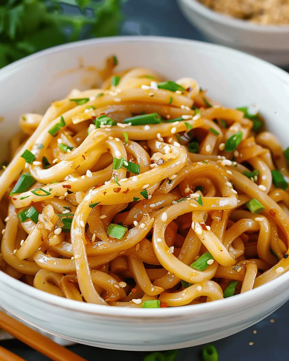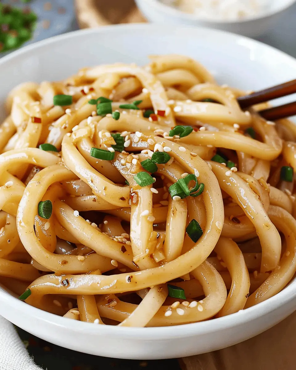 Finally, it’s time to serve up your delicious Vegan Garlic Udon Noodles. Garnish with chopped green onions and sesame seeds for that extra flair. If you’re feeling fancy, a sprinkle of chili flakes can elevate the dish even further.